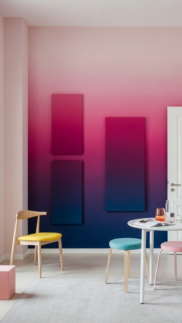 You’ll experiment with ombre gradients, bold matte finishes, or glossy lacquer; integrate acoustic panels as sculptural elements; keep furniture minimal so the wall reads like confident, freeing design.