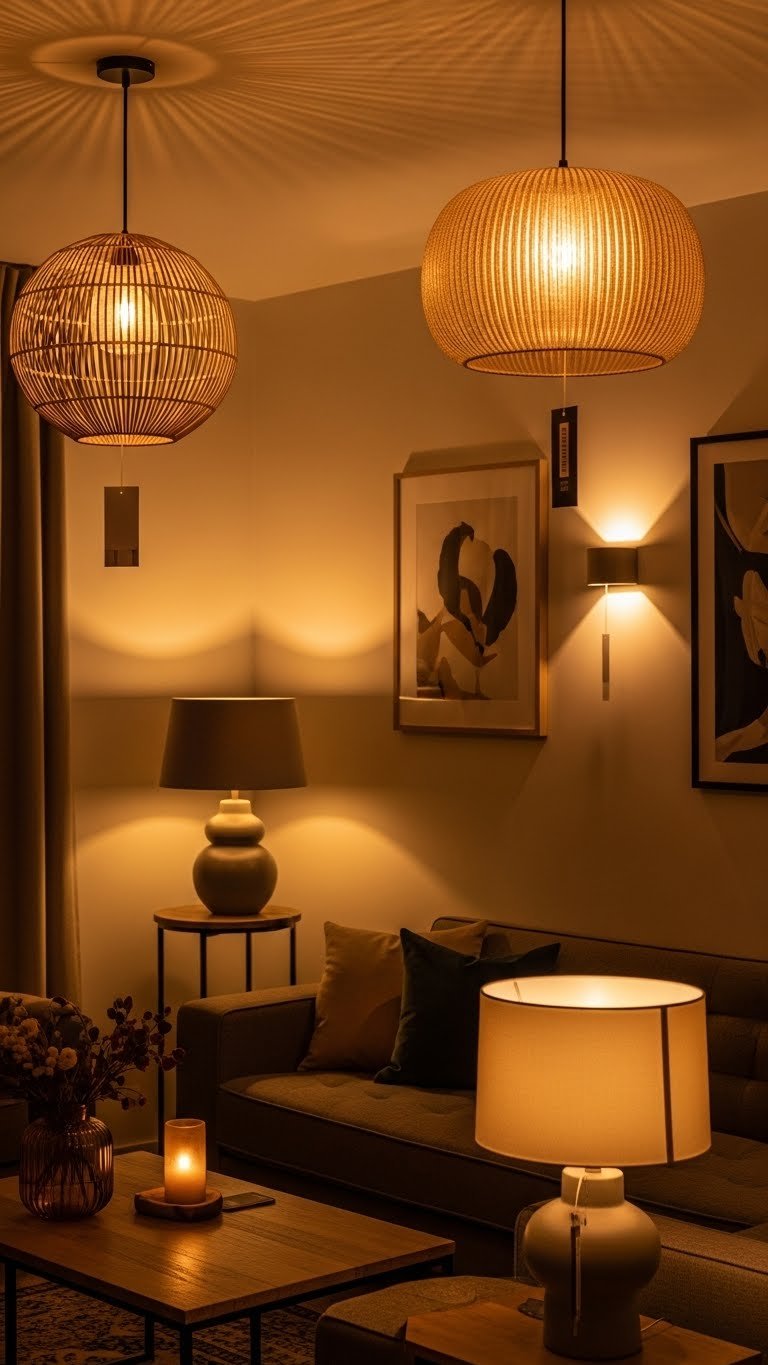 Often you’ll rely on layered, warm lighting to turn a flat space into something tactile and inviting—mix soft overheads, directional spotlights, and textured sources like woven pendants or ribbed glass to sculpt depth and mood.