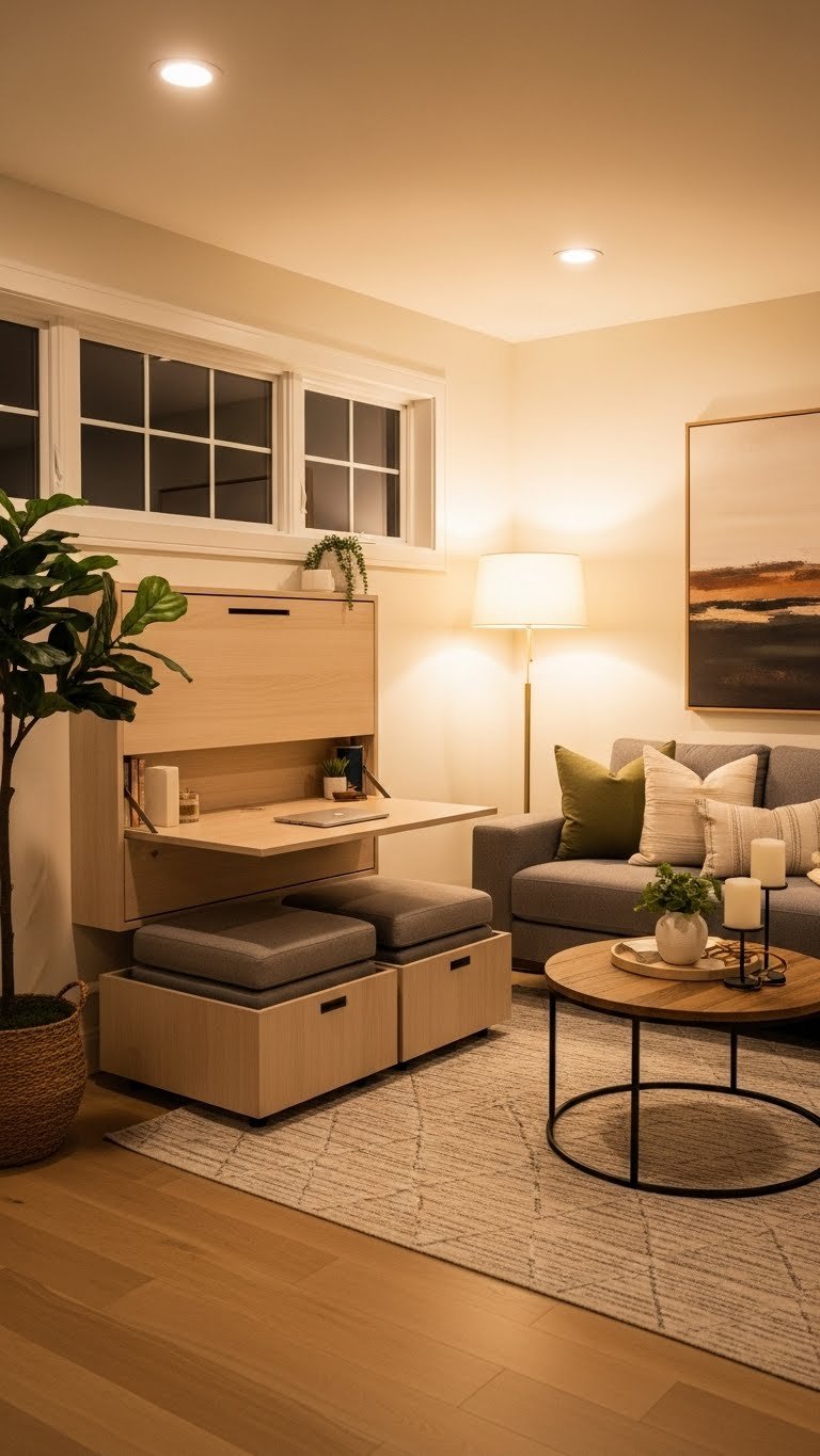 Warm, layered lighting sets mood — now let furniture do double duty so your space looks curated and works harder. Choose fold down desks that vanish when you need open floor, and hidden ottomans that stash blankets and serve as extra seating.