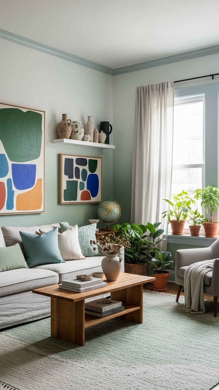When you layer sage green and misty ocean blue as your base, rooms instantly calm without going flat — these hues read as modern but lived-in, grounding furniture and finishes while letting accents sing.
