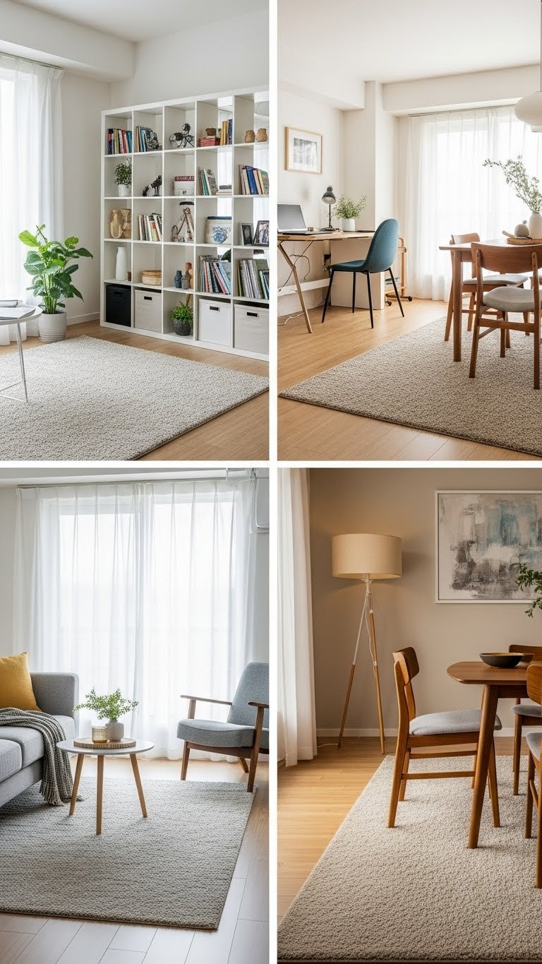 Define Zones With Area Rugs and Room Dividers
