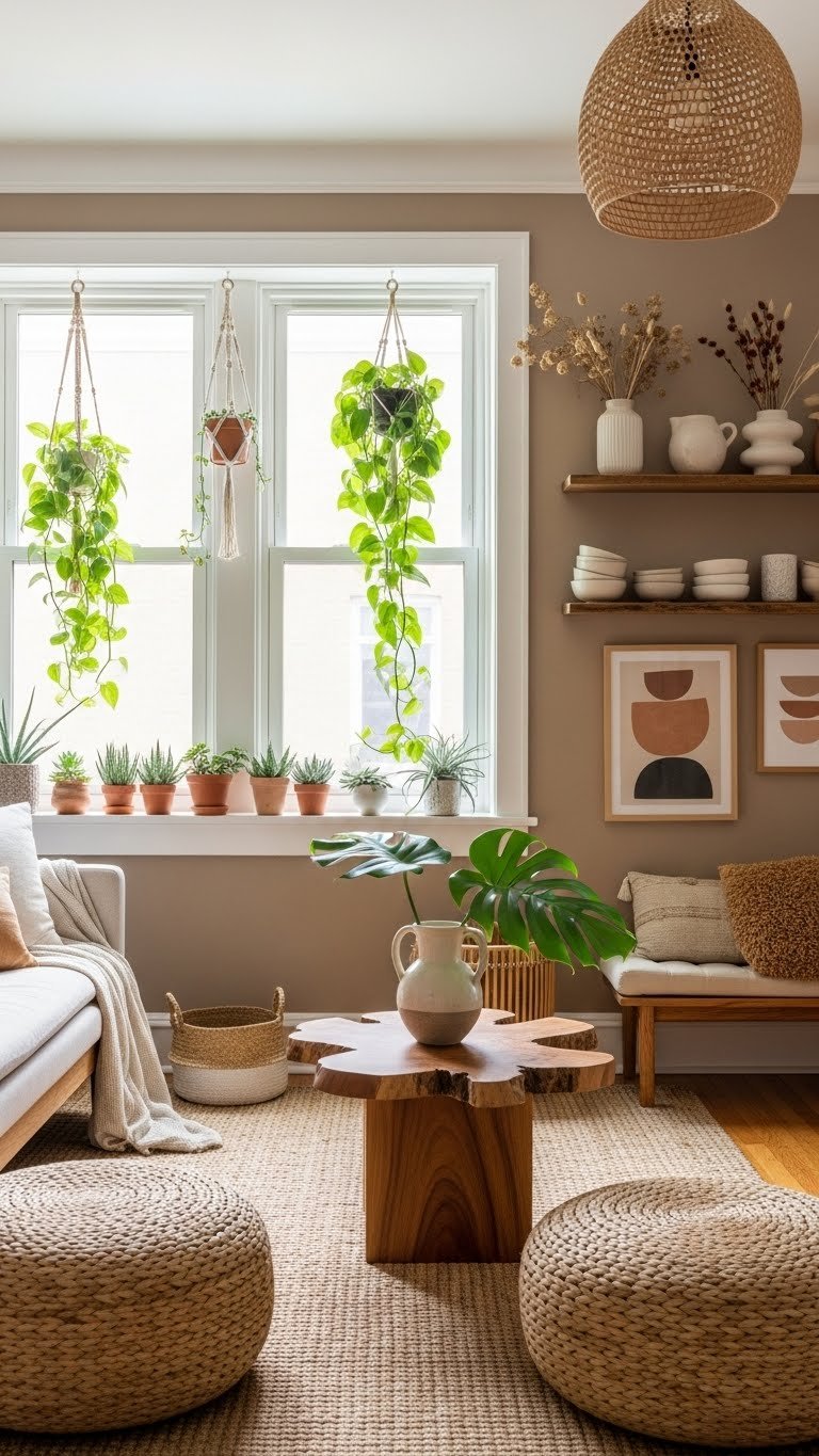 Pair those sustainable materials with living greenery to complete a conscious, luxe vibe. You’ll lean into air purifying succulents on sunlit sills, trailing pothos for effortless movement, and hanging macramé planters to free floor space and add boho polish.