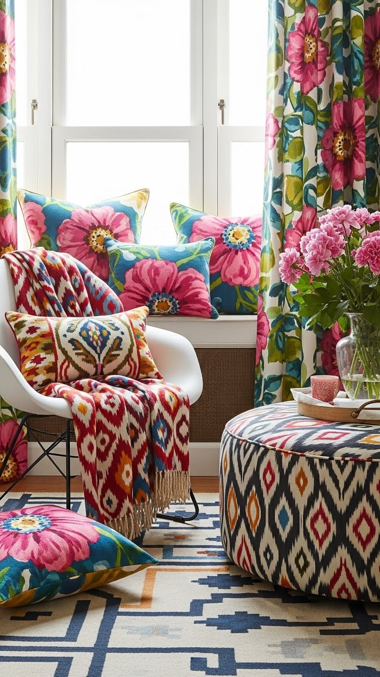 When you drench a cozy nook in bold prints, you turn a forgettable corner into the room’s focal point—think oversized florals, graphic geometrics, or a saturated ikat layered with textured throws.