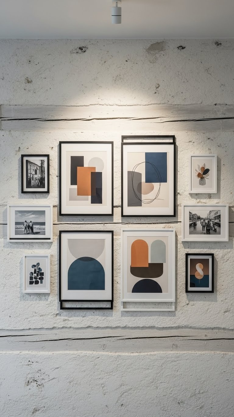 After you’ve set the tone overhead with plaster details or exposed beams, bring that same architectural rhythm down to eye level with a minimal gallery wall using geometric frames.