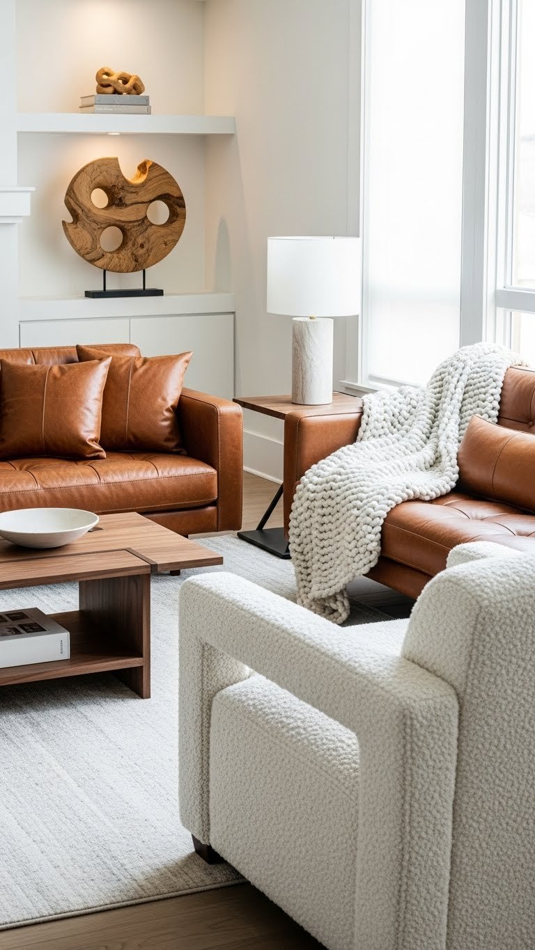 Mix leather’s sleek confidence with bouclé’s cloudlike texture to create a balanced, modern cozy look that’s both grounded and soft. You’ll pair a leather bouclé armchair or sofa with leather pillows, a boucle throw, and warm wood accents to celebrate material contrast.