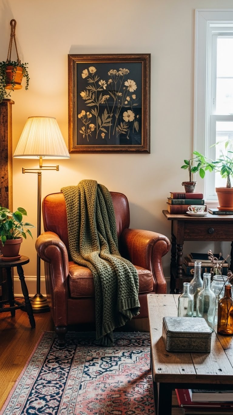 Hunt down a few well-loved vintage pieces to give your space a voice—think a scuffed leather chair, a framed botanical print, or a brass lamp with personality. You’ll lean into thrifted finds and playful heirloom sourcing, mixing eras for effortless charm.