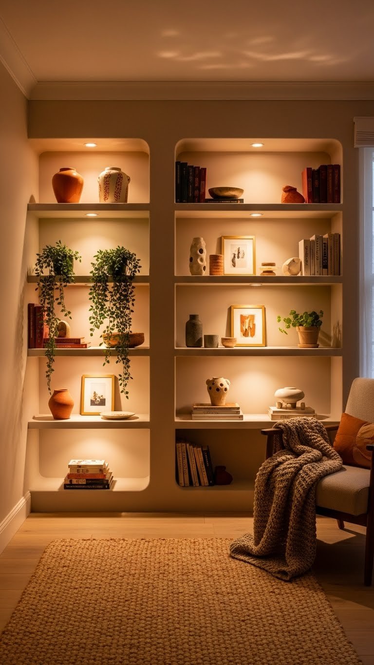 You’ll love how rounded shelving and seamless alcoves create gentle vignettes for books, plants, and curios. Install dimmable lights, choose muted tones, and let each nook invite you to linger freely.