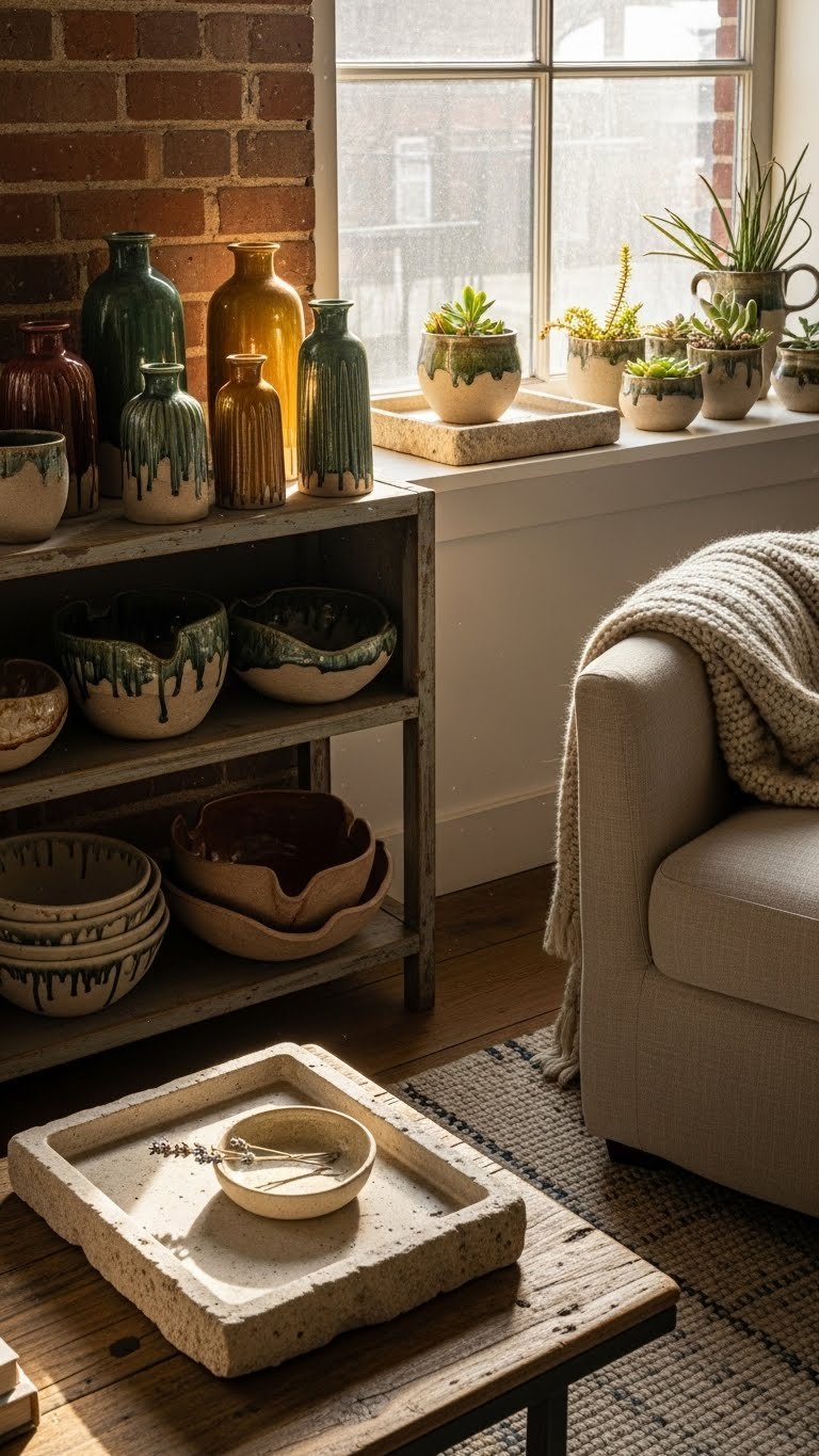 You’ll mix handmade glazework vases, sculpted bowls, and rough-hewn stone trays to create inviting vignettes.