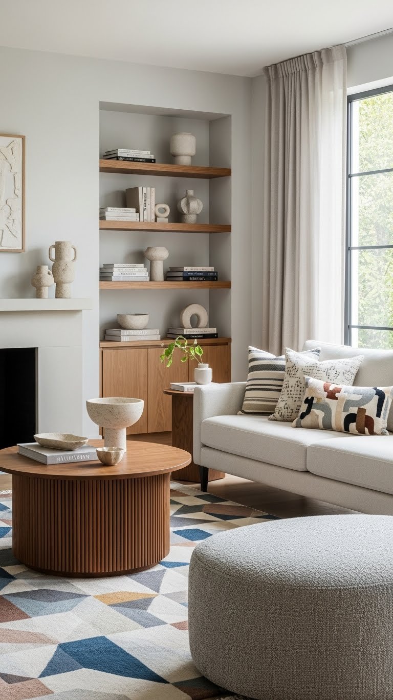 After layering patterns and color, pick a coffee table shape that calms the composition—cylindrical and oval tables do that beautifully. You’ll love how an oval ottoman softens traffic flow and invites lounging, while a sleek cylinder centerpiece anchors the vignette without crowding.