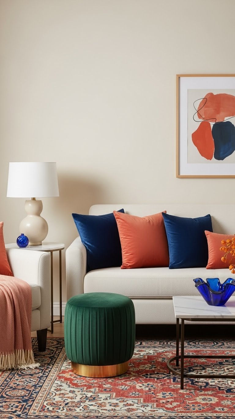 You’ll mix coral contrasts with muted neutrals for playful energy, or lean into blue harmony for calm, expansive vibes. Swap shapes and fabrics freely to keep the look personal and effortless.