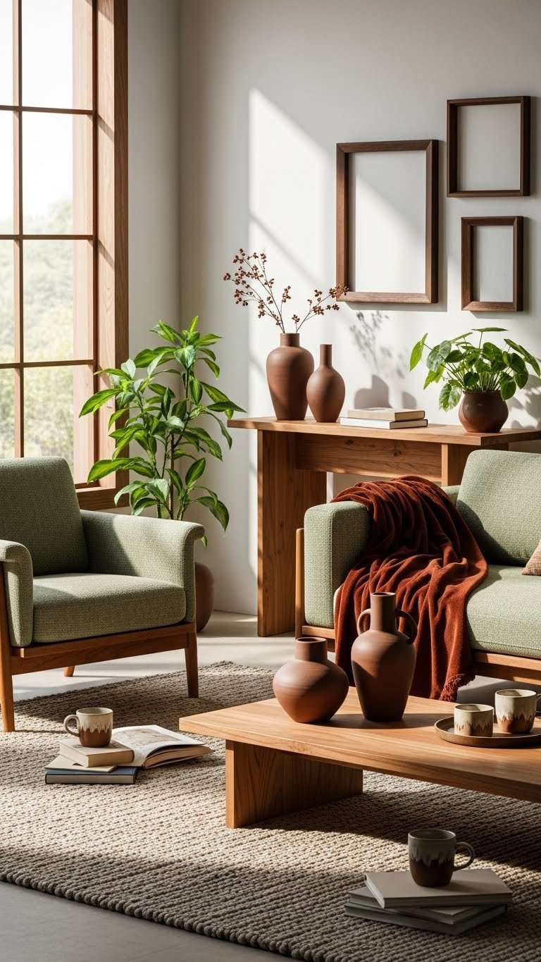 Move from the tactile calm of Neo‑Naturalism into a color story that feels quietly rich: chocolate browns and soft sage greens. You’ll layer chocolate accents—velvet throws, ceramic vases—against sun-warmed woods, then anchor seating with sage upholstery.