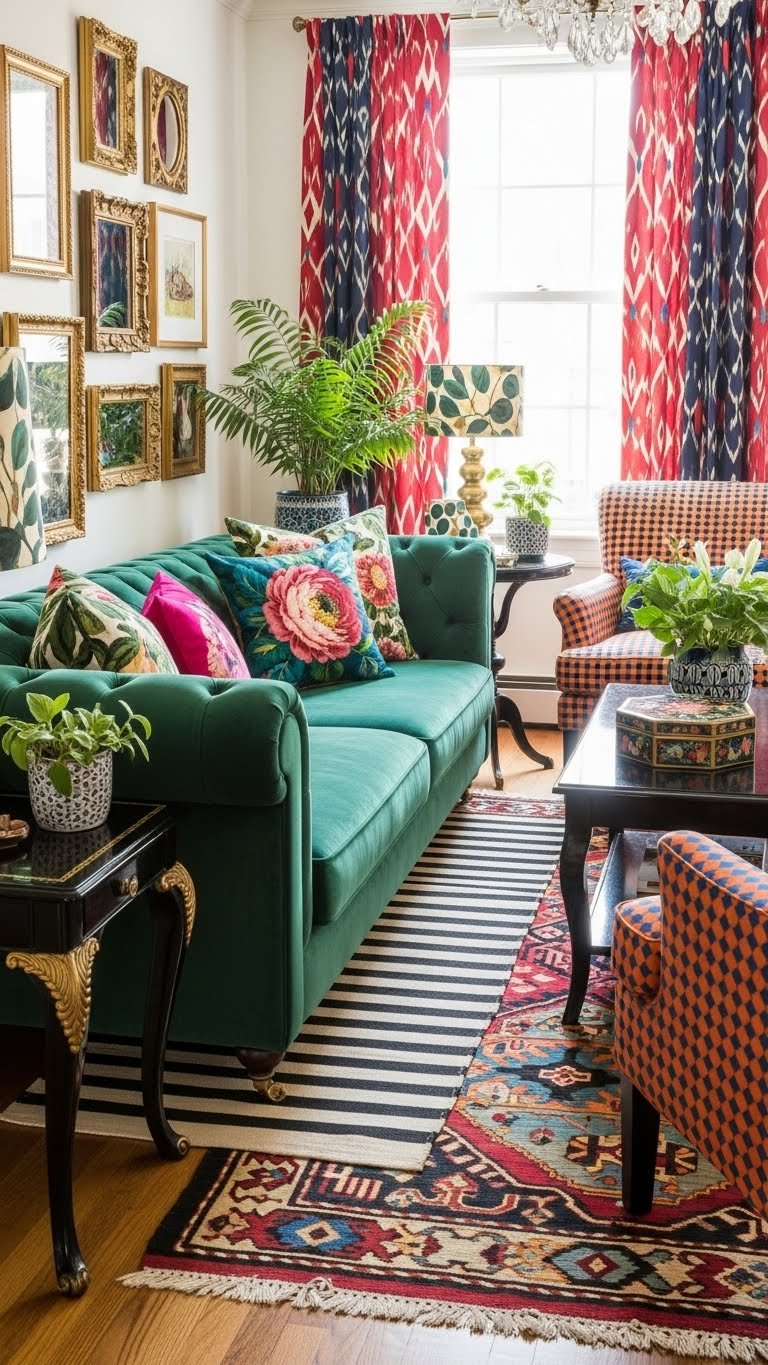 You’ll mix bold florals with patterned upholstery, velvet tufting, kilim rugs and lacquered accents to craft a liberated, confident room that feels curated and alive.