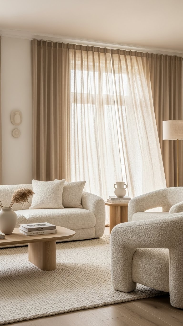 You’ll mix looped weave upholstery with airy, neutral drapery, balancing plush resistance and relaxed flow so your space feels liberated, modern, and quietly sumptuous.