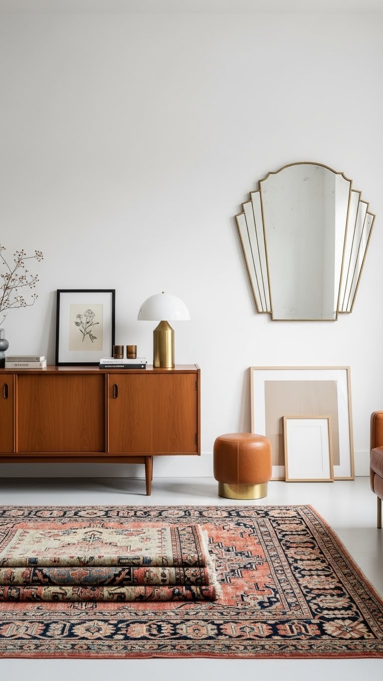 Layer oversized rugs with a mid-century credenza or an Art Deco mirror to let old-world character play against clean contemporary silhouettes. You lean into patina contrasts—brass edges, soft leather wear—while keeping minimal frames and airy space.
