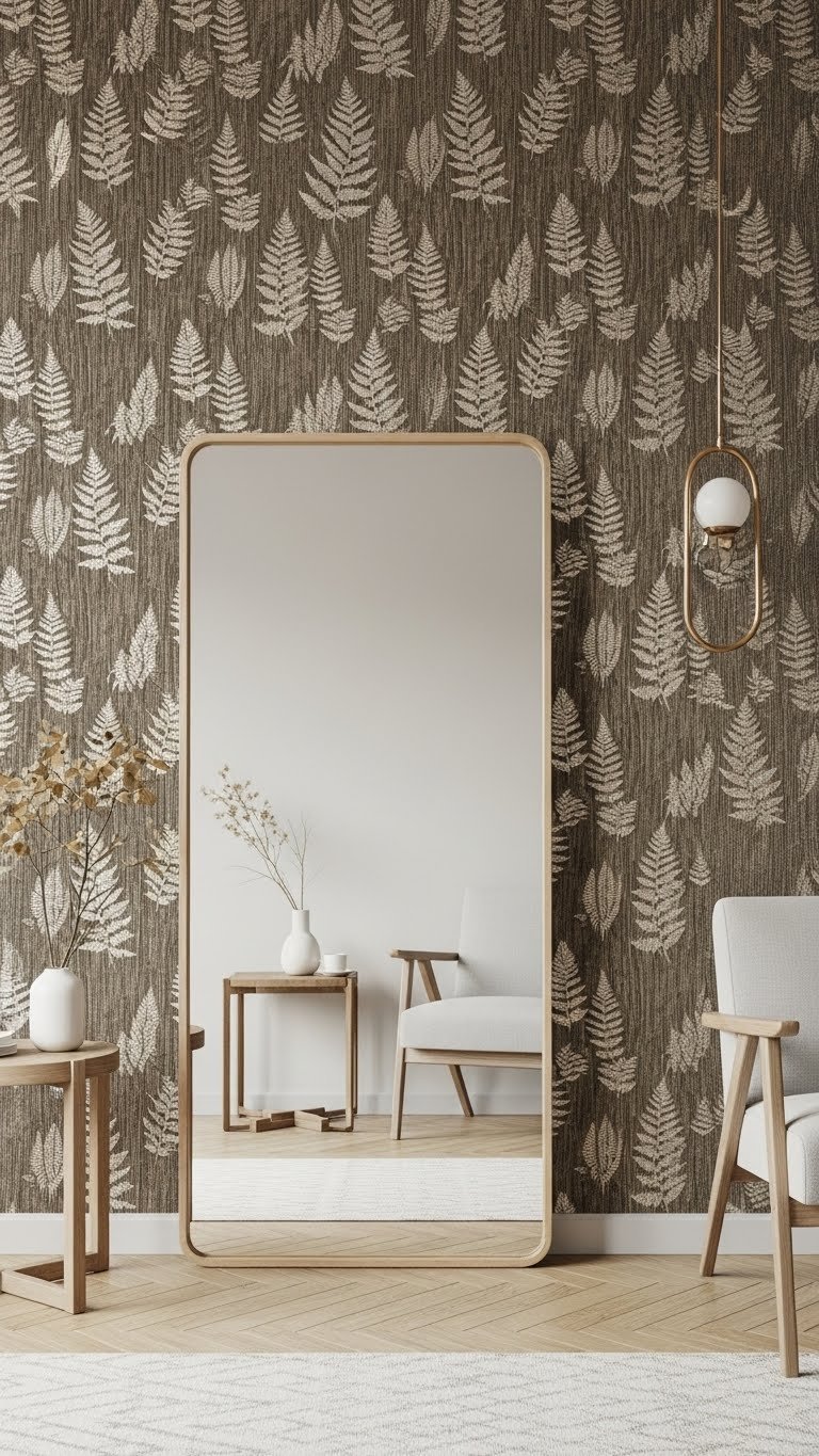 A statement mirror bounces light and personality around a room; textured wallpaper builds on that energy by giving surfaces the same sculptural presence without adding clutter.