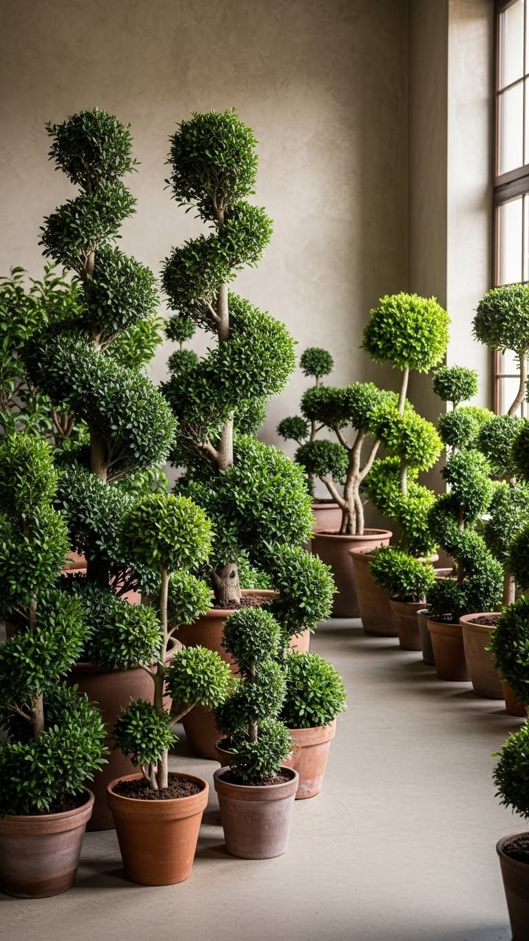 Bring indoor greenery into sculptural focus by arranging topiaries and mini groves that read like living installations—trimmed spirals, cloud-pruned lollipops, and clustered trunks that create rhythm and scale.