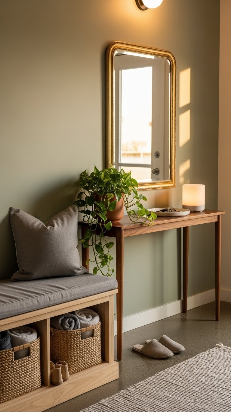 You’ll pair an anchored shoe‑bench with woven baskets, a slim console and mirror to catch light, and a plant that breathes.