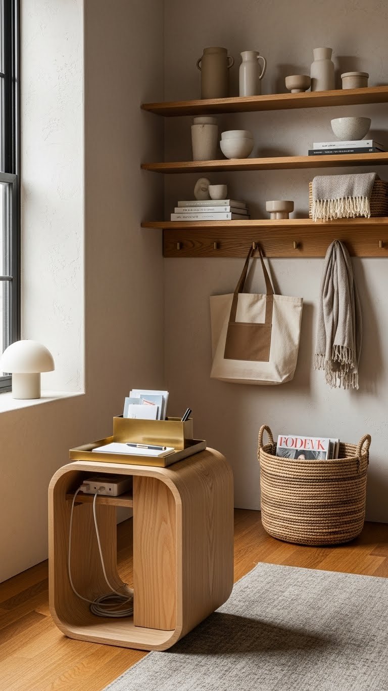 Lean into pieces that do double duty: a sculptural side table that hides chargers, a chic tray that keeps mail tidy, or open shelving arranged to showcase objects but still store everyday essentials. You’ll choose tactile finishes, muted brass hooks, and woven baskets that privilege functional beauty.