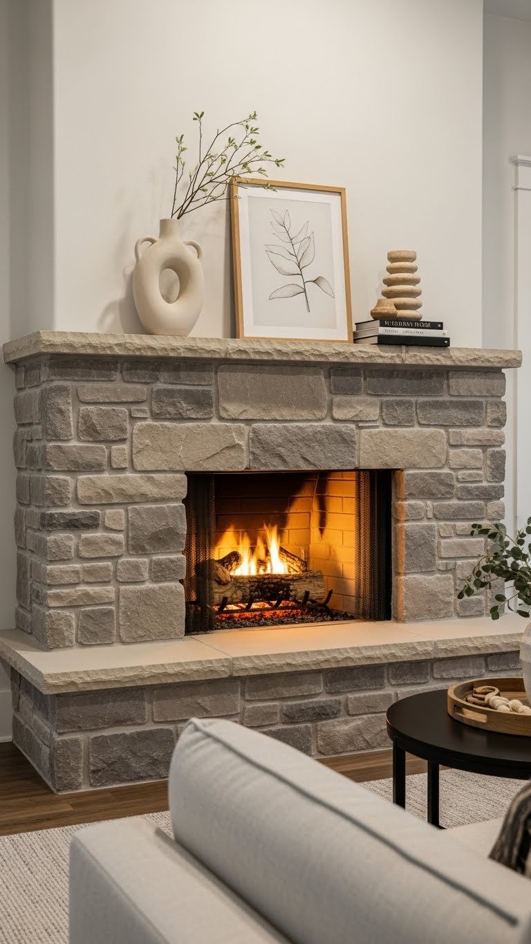 When you center a room around a stone fireplace, the space instantly feels grounded and intentional; choose stones with subtle variation in tone to keep the neutral palette cohesive while adding tactile interest.