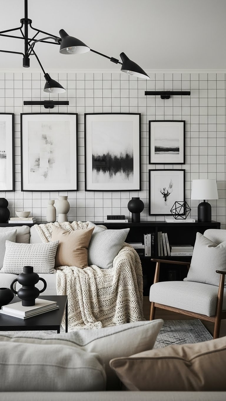 You’ll punctuate airy walls with matte hardware, slim frames, and sculptural lighting.
