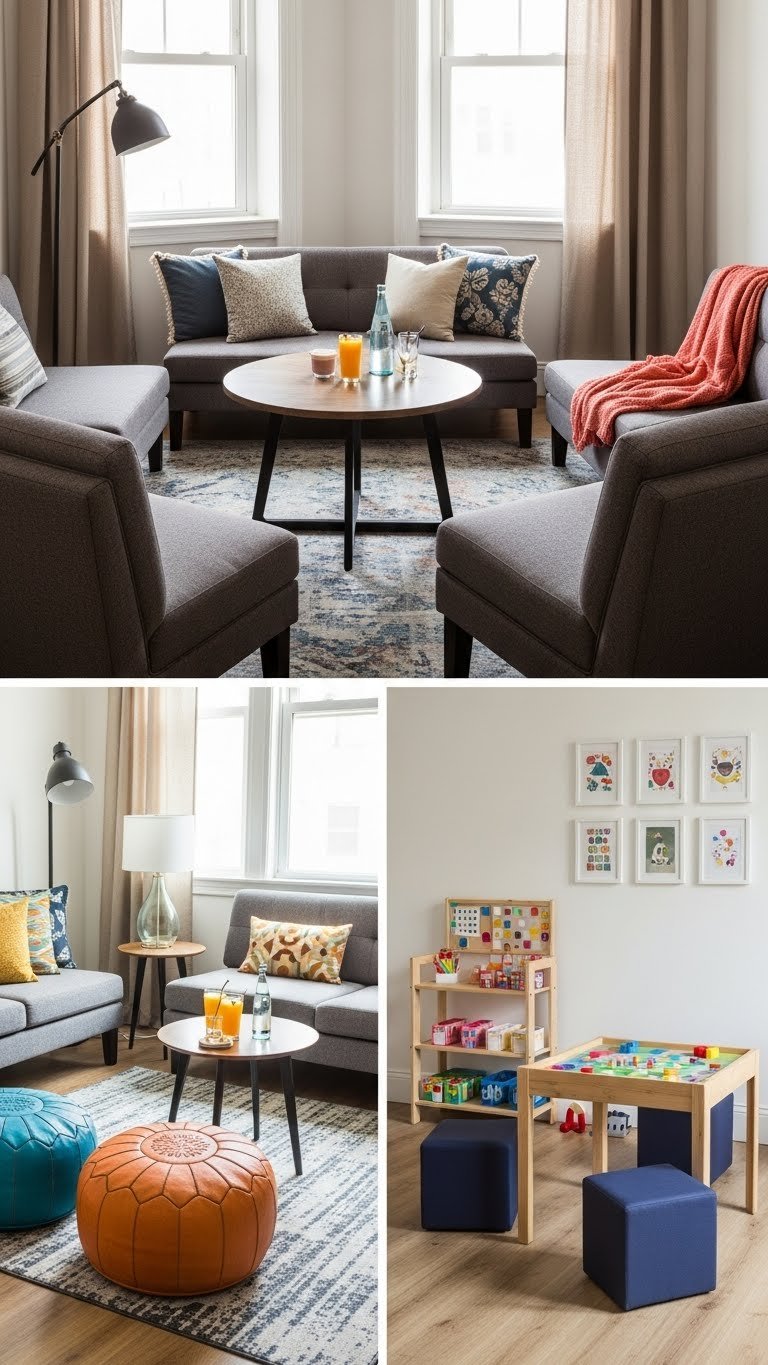 When you plan for guests, break the room into distinct zones—an intimate conversation nook, a casual lounge for drinks, and a flexible spot for games or kids—so people can flow naturally and conversations don’t compete.