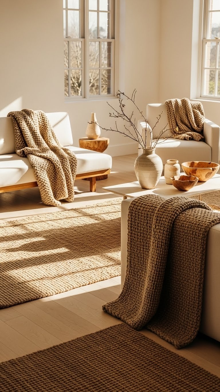 Against a backdrop of pale woods, coarse weaves add tangible depth and a modern artisan feel. You’ll layer pale ash planks with raw jute rugs and chunky woven throws to create tactile contrast without fuss.