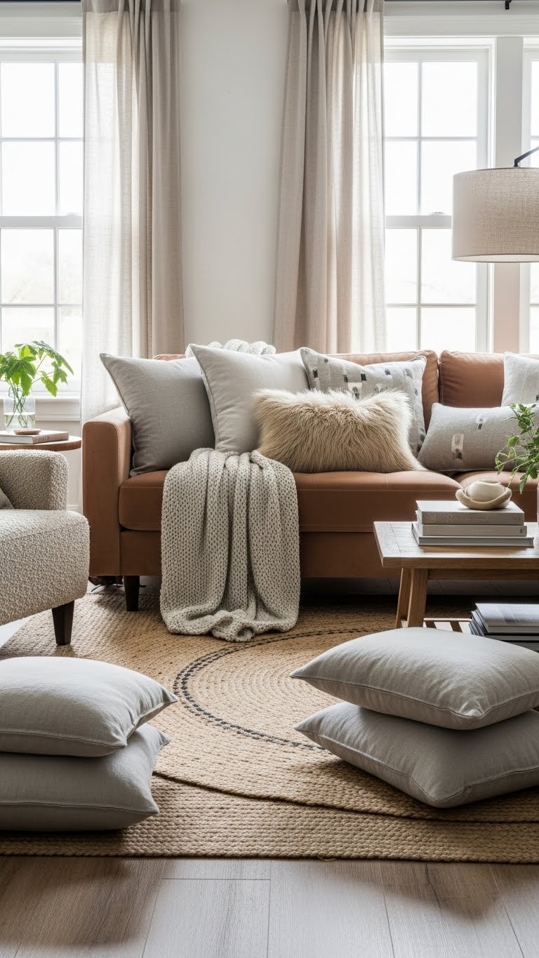 You’ll create plush contrast and intentional texture sequencing: pair smooth sheen with raw weave, repeat tones for flow, and let tactile variety invite relaxed, free living.