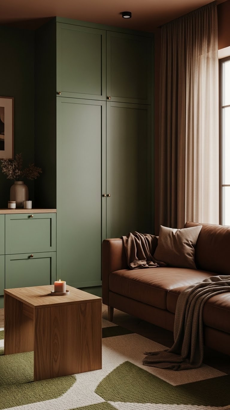 You’ll pair mocha textiles with moss cabinetry, woven rugs, and matte brass hardware.