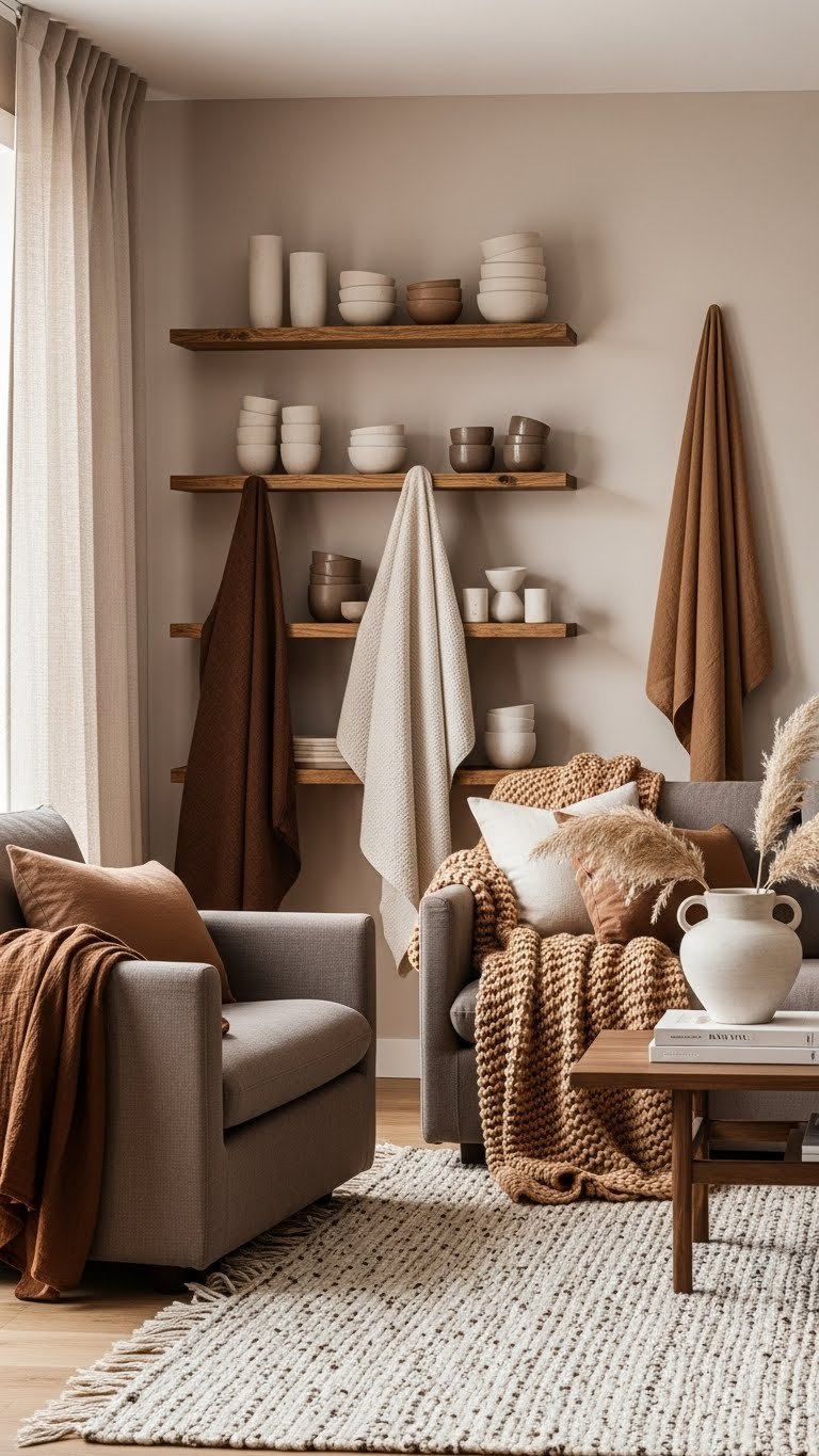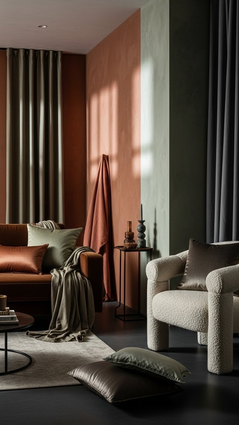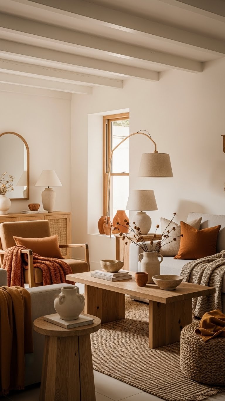 When you layer terracotta, olive, and coffee tones against warm neutrals like cream, honey, and sandstone, the room feels grounded yet effortlessly modern.