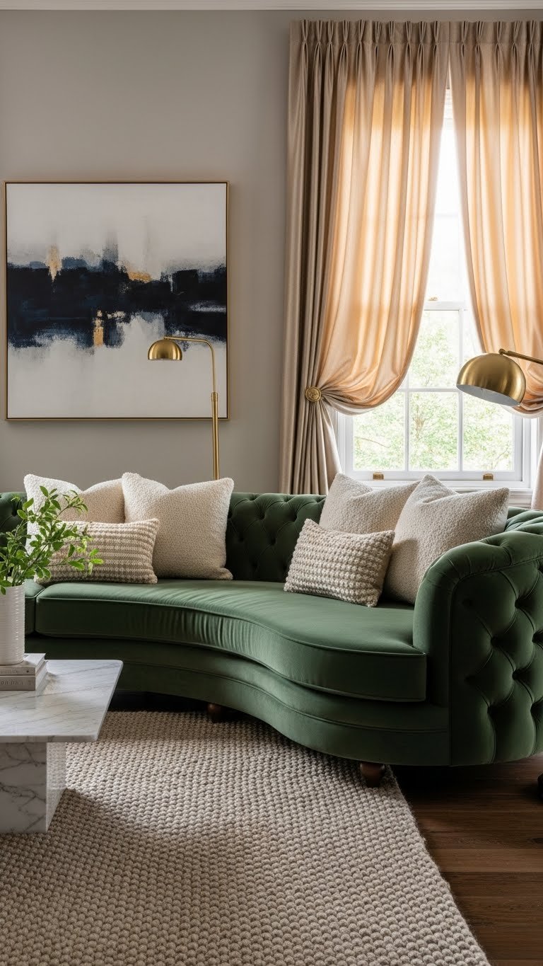 If you want a room that feels both sculptural and inviting, introduce a crescent sofa opposite an arched mirror to amplify curves and light.