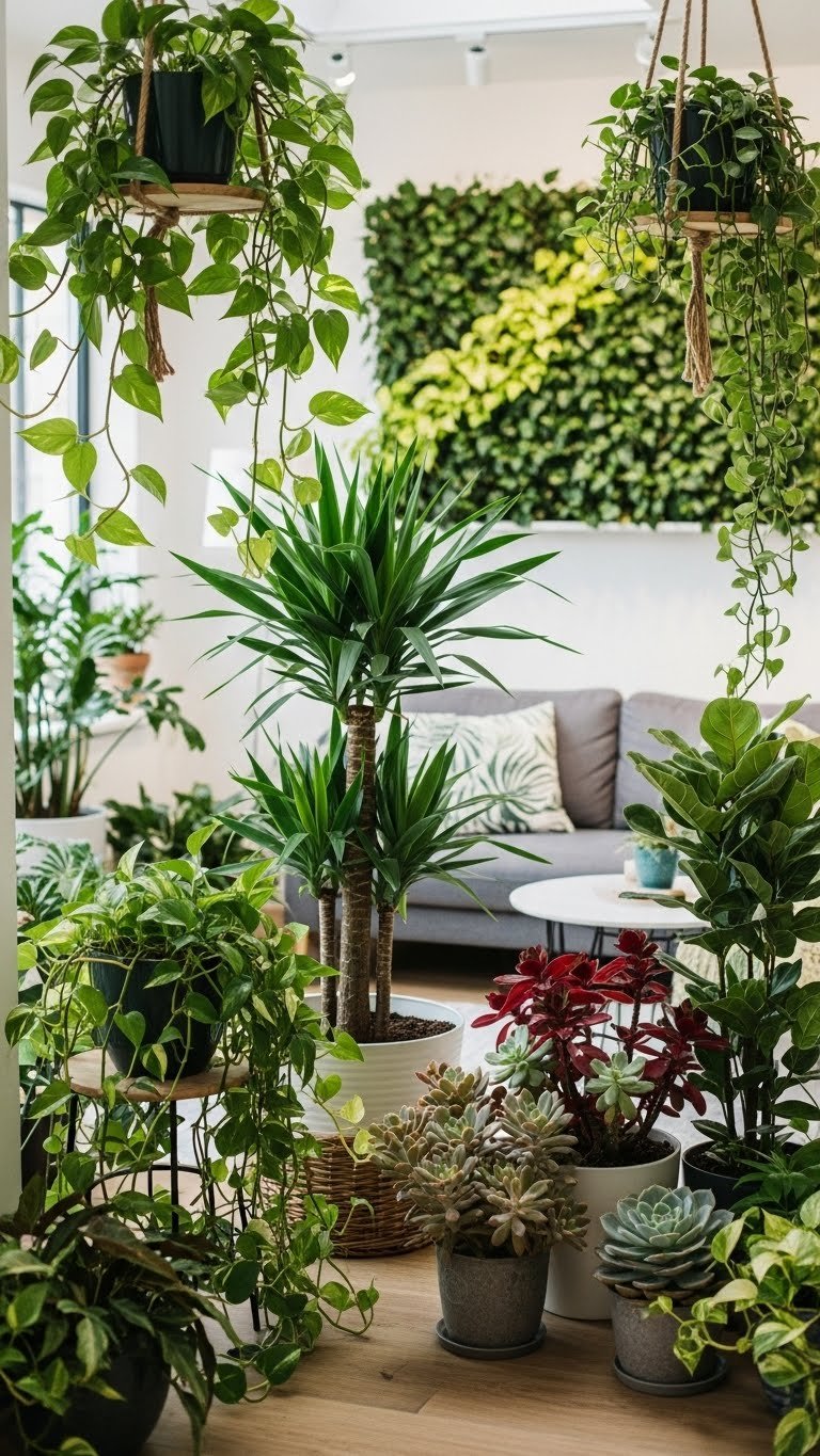 Layer pots at different heights, add a living wall for drama, and choose air purifying houseplants to boost wellbeing. Let greenery frame seating, float on shelves, and keep your space free and alive.