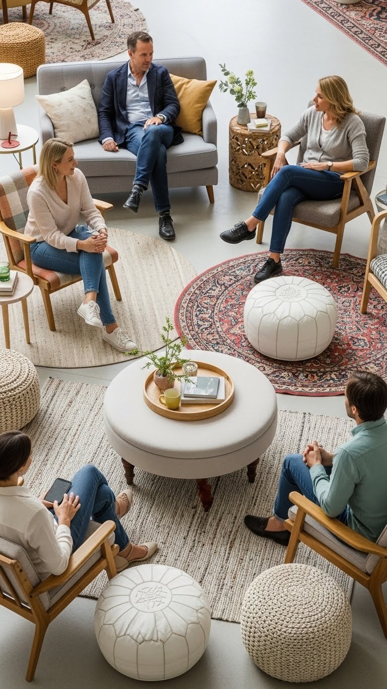 If you want conversations to flow, arrange seating in a soft circle so every face is visible and no one feels sidelined.