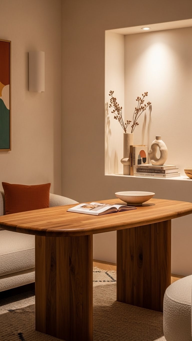 Anchor a cozy nook with a sculptural table or a standout focal piece to give the space personality and purpose. You’ll choose a sculptural vignette or a slim niche console to define function without clutter.