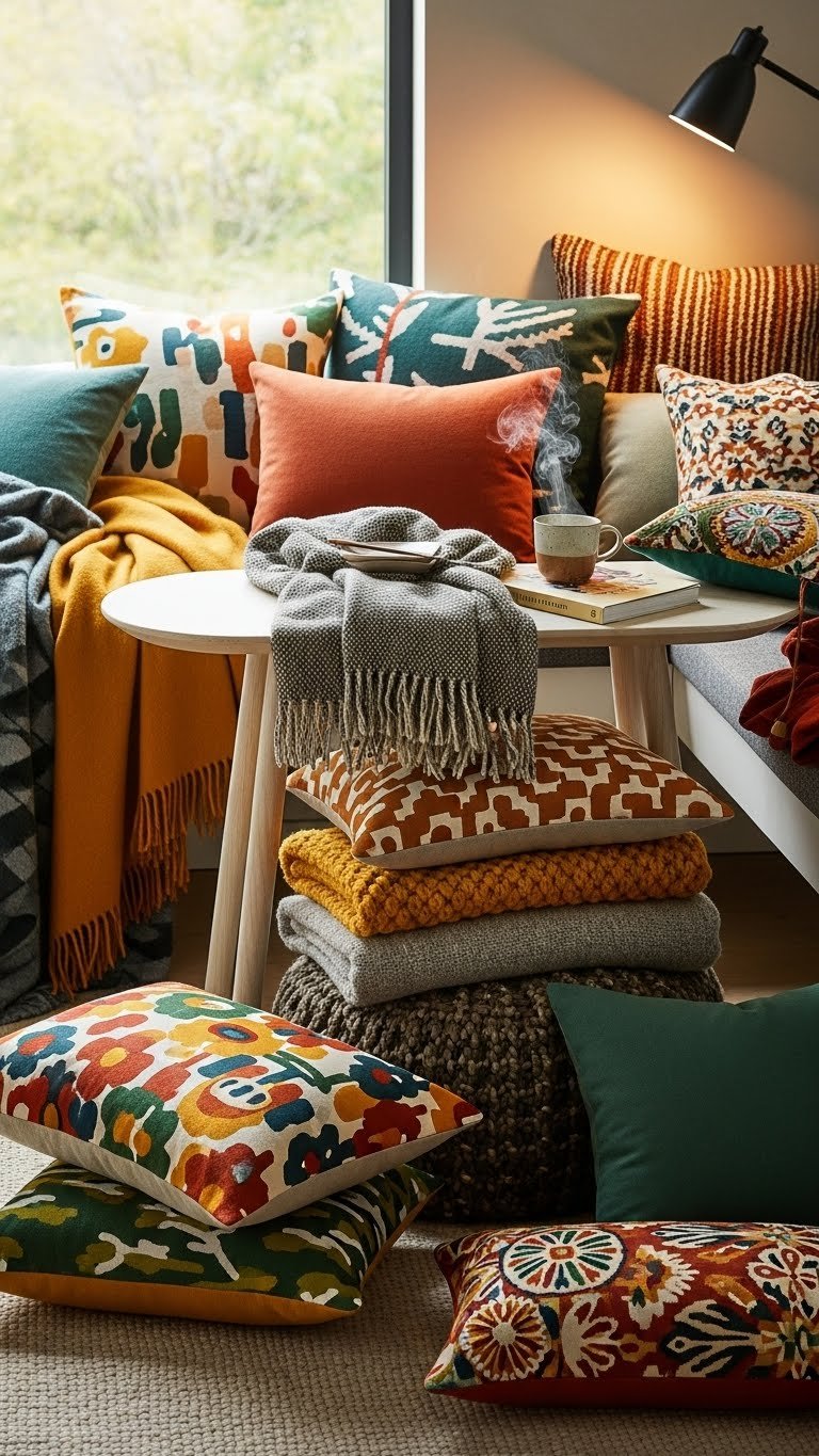 You’ll mix mismatched textures—nubby wool, linen, bouclé—then balance bold prints with muted solids. Rotate pieces for seasonal colorblocking, swap throws for warmth, and scatter cushions so the space feels effortless, playful, and freely yours.
