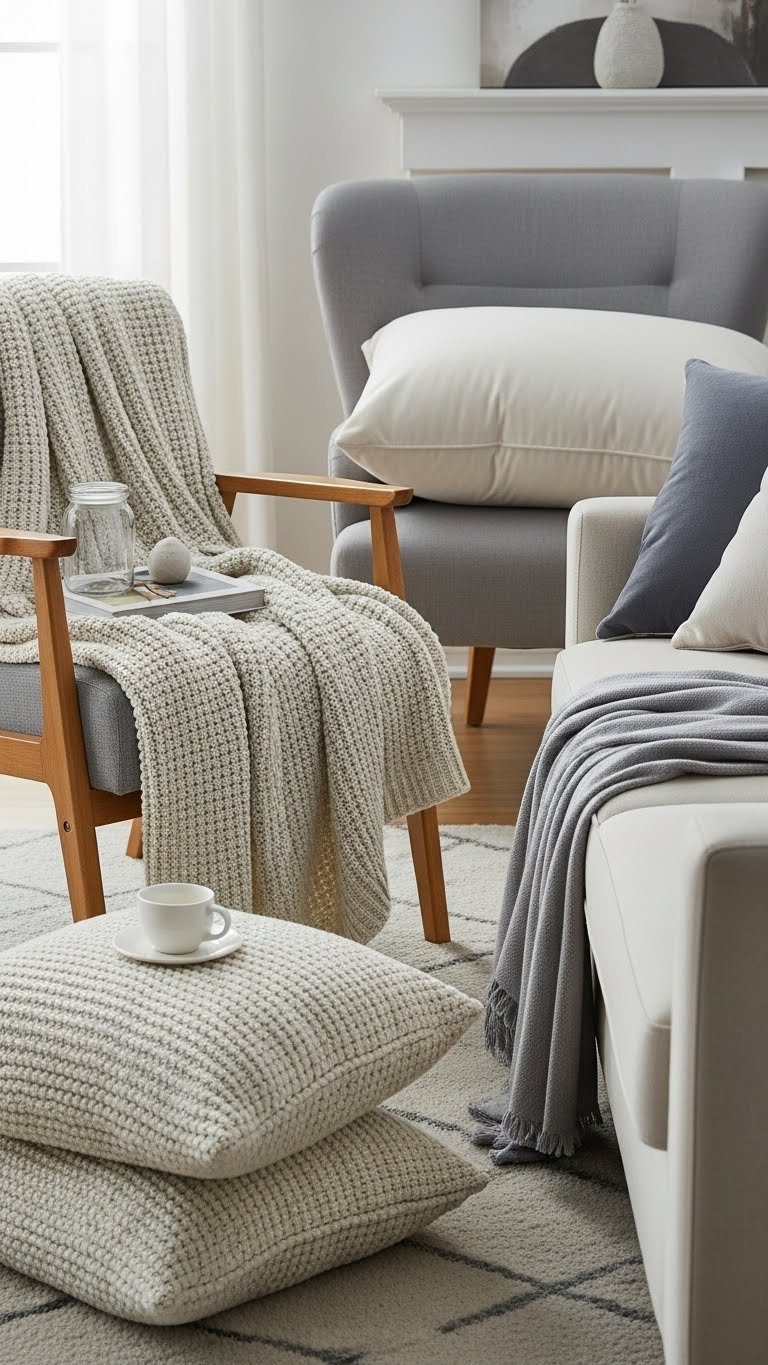 You’ve set a calm, neutral base—now make it inviting by layering plush blankets on every seat. Drape one in a soft knit, tuck an oversized lumbar at the back, and add a lightweight throw for evening warmth.