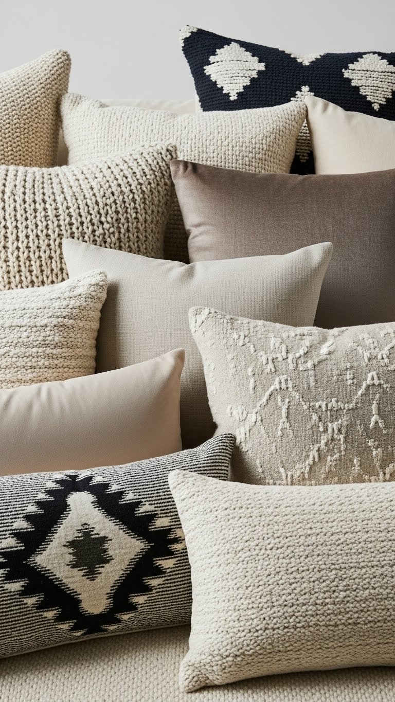 Rotate sizes and shapes, balance color weight, and tuck pillows casually so your space feels effortless, tactile, and inviting.