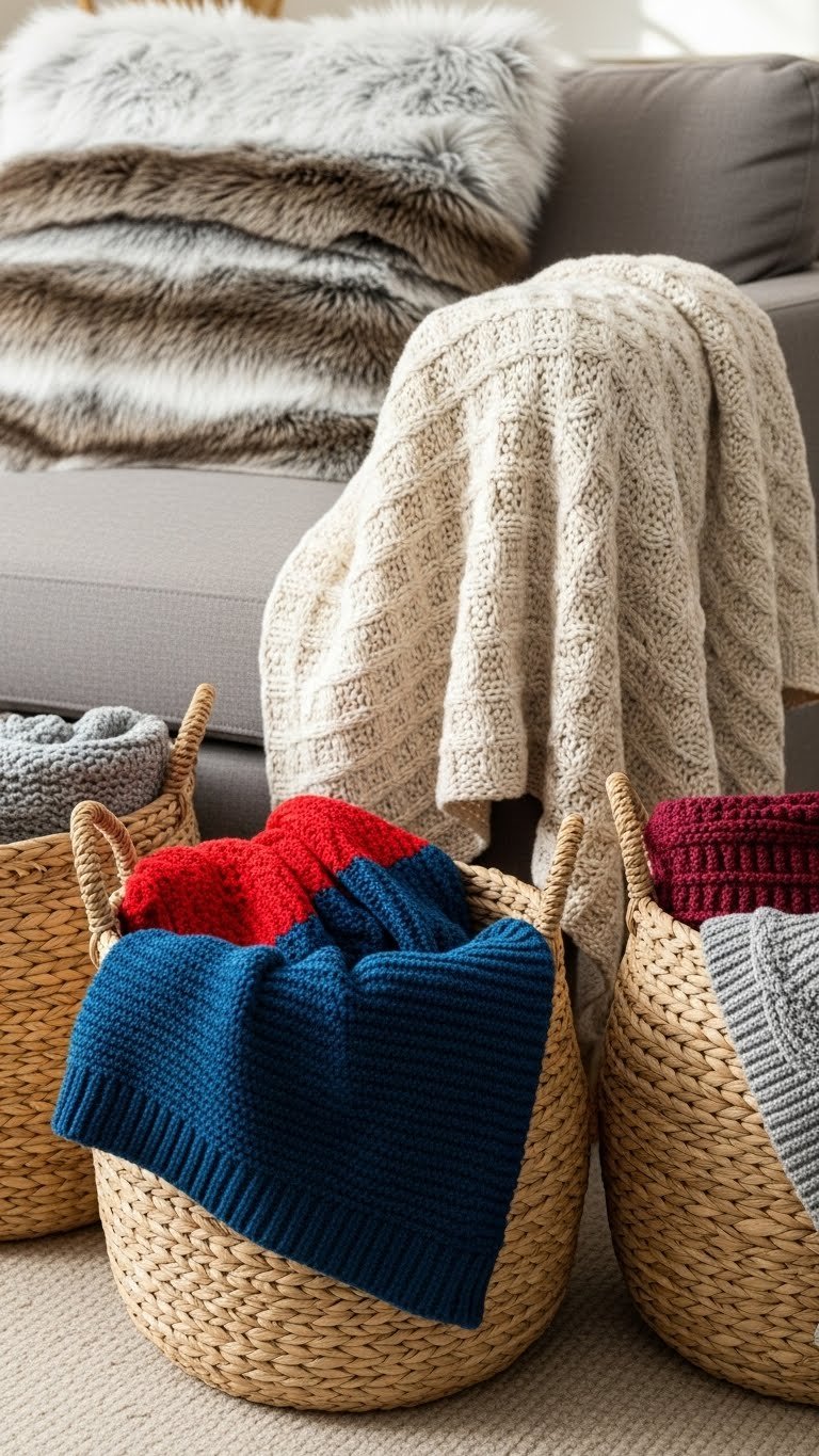 After you’ve layered faux fur for luxe warmth, bring in cozy knit throws tucked into baskets to add casual texture and easy access.