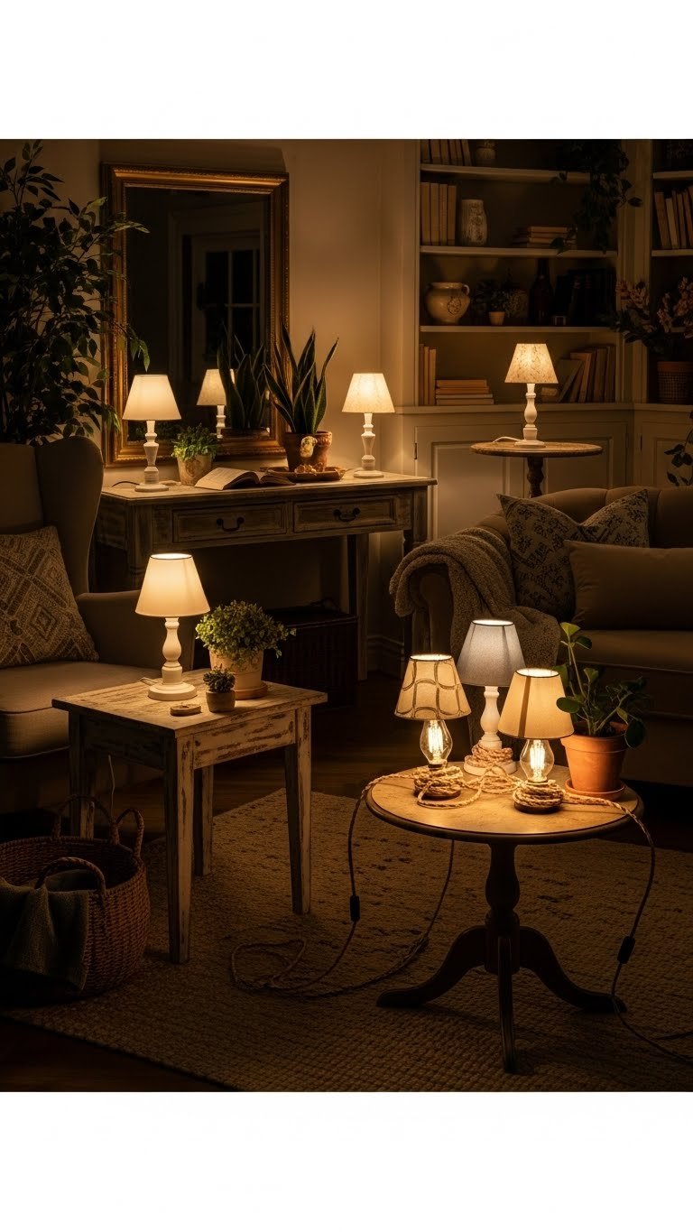 You’ll place mini lamps on side tables, consoles, and shelves to create layered warmth.