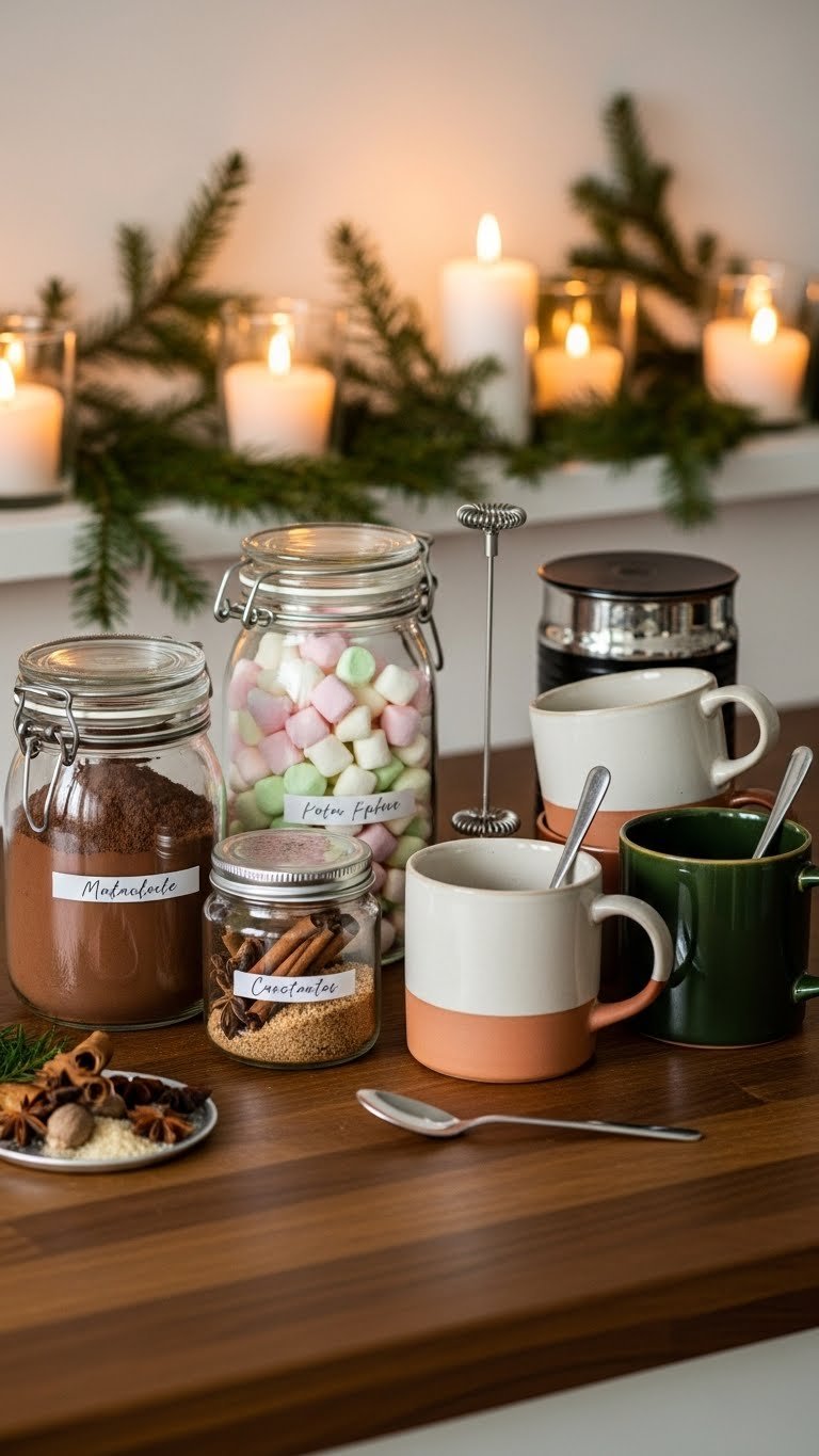 After styling your mantel with evergreens and candles, bring that same cozy mood into the kitchen by setting up a dedicated hot chocolate bar. Curate a minimalist hot cocoa station with glass jars of cocoa, marshmallows, and spices.