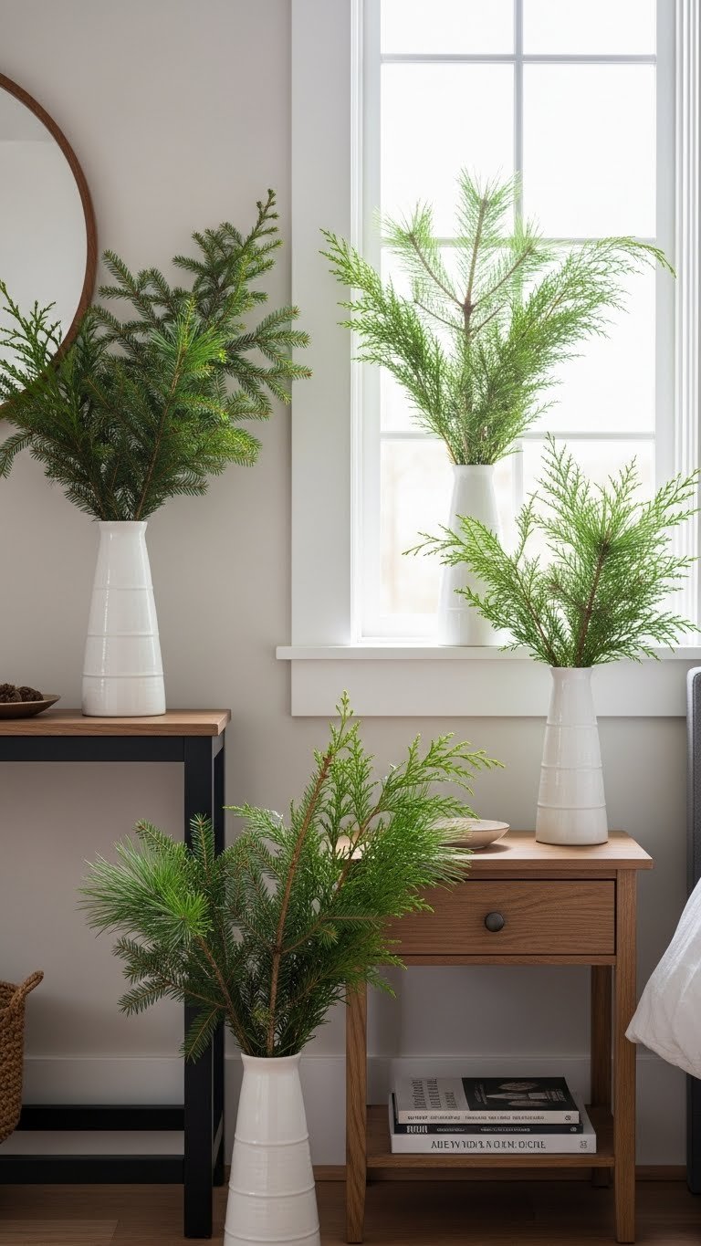 Often you’ll find that a few evergreen stems instantly lift a room; tuck sprigs of fir, pine, or cedar into simple vases to add texture, scent, and seasonal color.