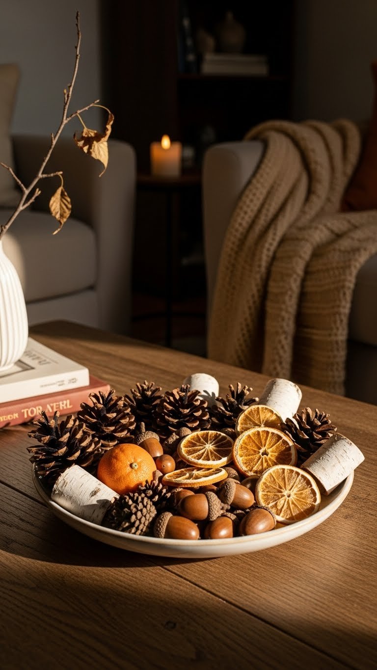 You’ll find that a simple bowl filled with pinecones and a few natural accents instantly grounds a room—pick cones of varying sizes, mix in acorns, dried citrus slices, or birch bark, and arrange them loosely so the display feels intentional, not staged.