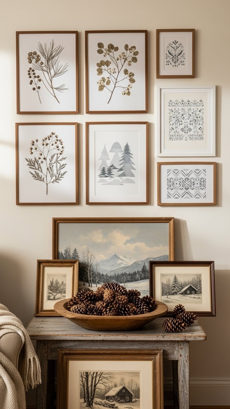 Keep the natural mood going by swapping in winter-themed artwork and a few vintage prints to complement your pinecone bowl. Choose framed botanicals and muted Nordic lithographs to evoke calm, then mix scales—small vintage etchings with a larger landscape.