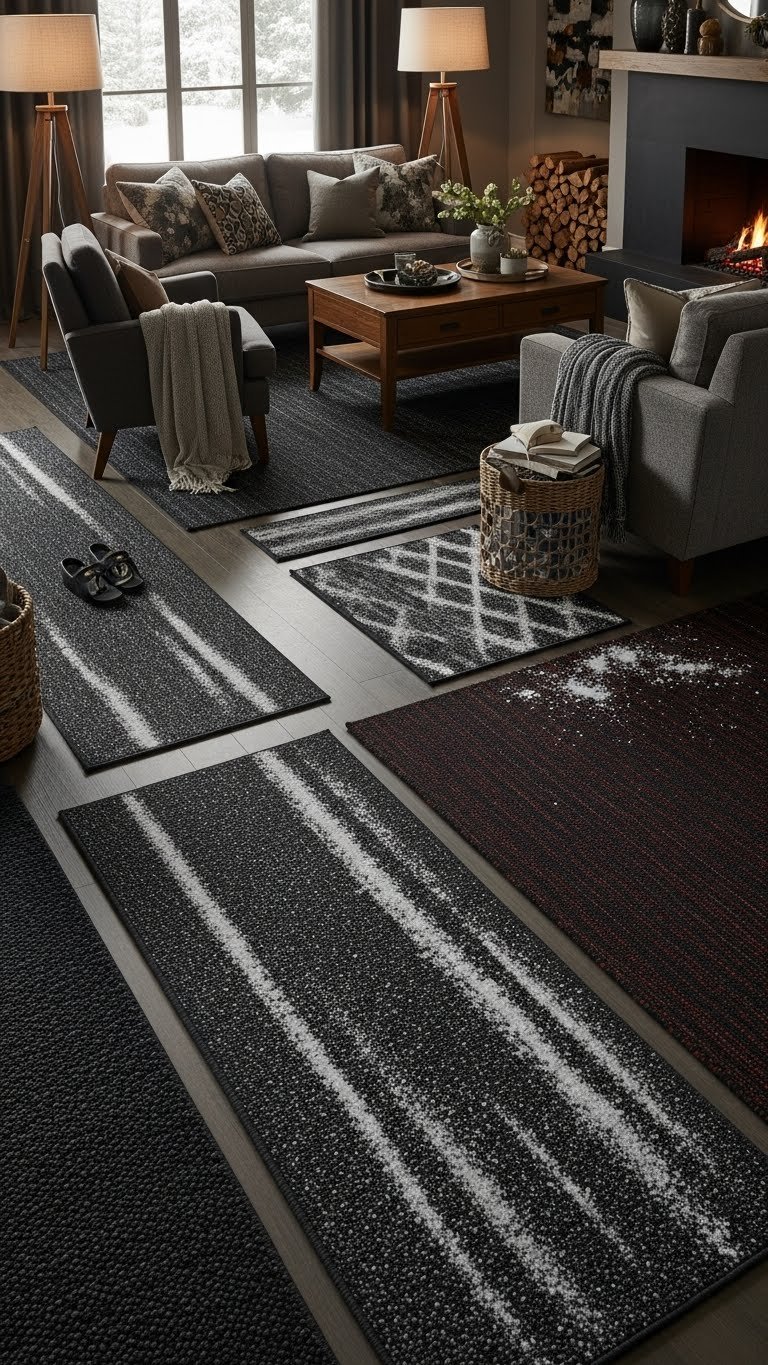 Bring in darker rugs to mask slush, salt streaks, and tracked-in dirt without sacrificing style. You’ll choose stain resistant rugs in deep hues and tactile weaves that let you roam freely without worry.