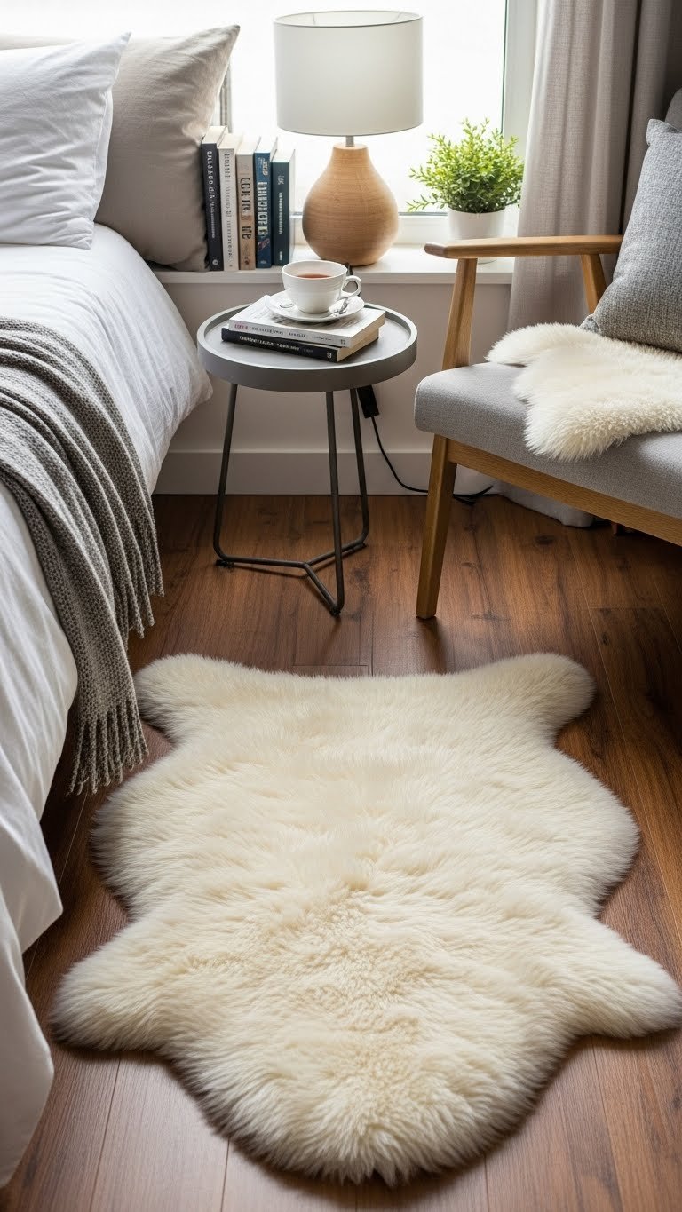 Often you’ll want to sink your feet into something soft the moment you step inside; a sheepskin rug does exactly that, warming cold floors and instantly softening a room’s look.