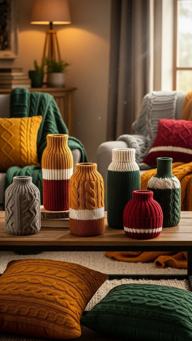Layer a cozy story into your space by draping upcycled sweaters over vases and throw pillows—it’s an easy, sustainable way to add texture and color. You’ll create sweater wrapped vases that soften glass and knit visual warmth.