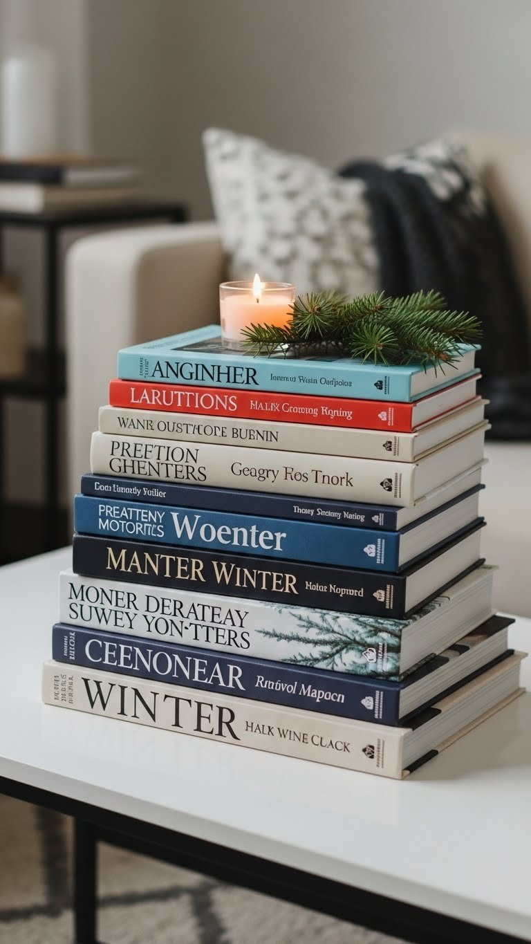 Pick a few seasonal books and stack them on your coffee table to set the tone for the room—choose covers and spines that echo your winter palette, vary the heights for visual rhythm, and tuck a small candle or pine sprig on top to anchor the vignette.