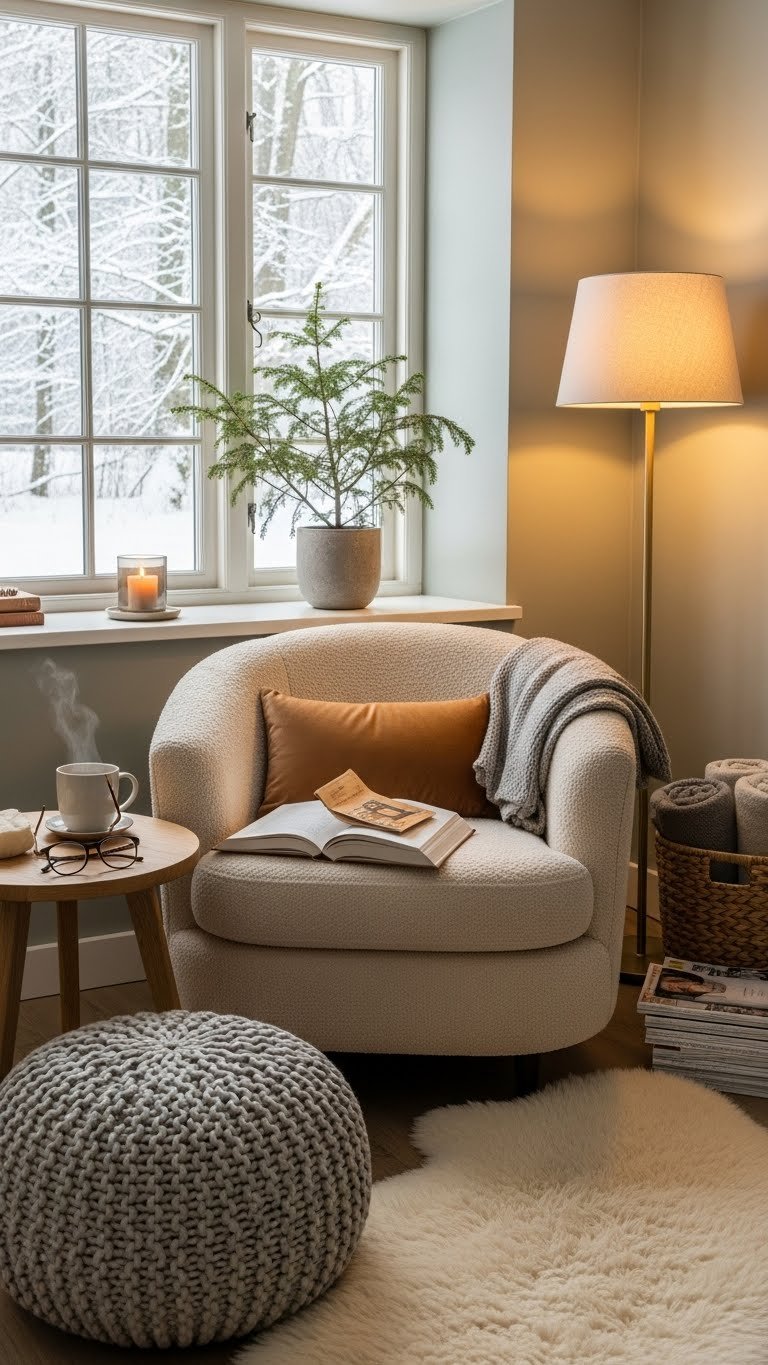 Tuck a soft reading chair into an unused corner to instantly carve out a quiet winter sanctuary; choose a chair with rounded lines and plush upholstery that invites you to sink in.
