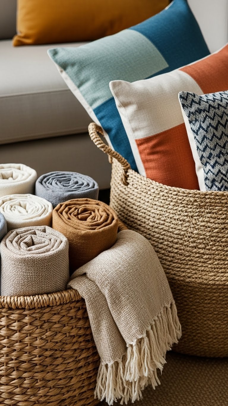 Often, you can instantly warm a room by styling throws and pillows in coordinated baskets—choose textures and colors that echo your room’s palette, roll or loosely fold throws for easy access, and nest a few pillows upright so they look intentional rather than tossed. Use a woven basket for structure, mix solids and patterns, and try subtle color blocking to keep the look liberated and tidy.