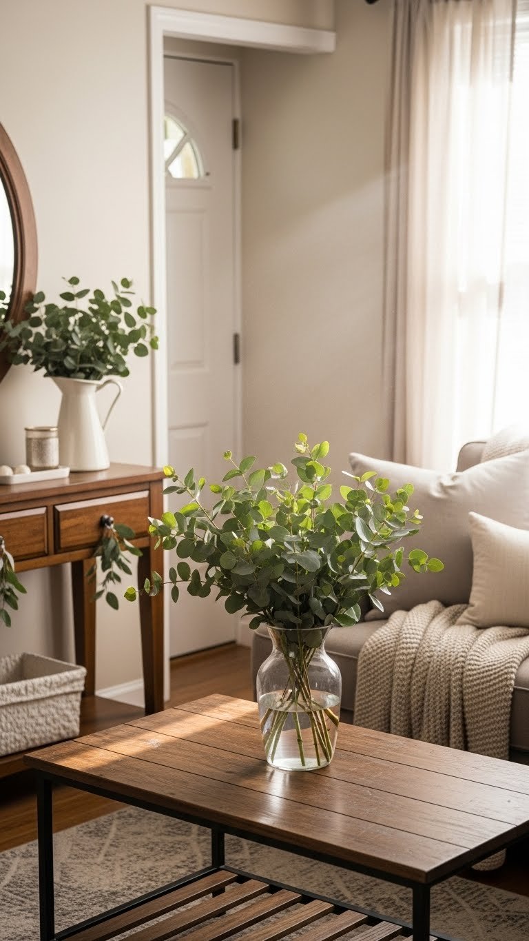 You’ll want to place bouquets of eucalyptus where you pause most—on the coffee table, bedside dresser, or entry console—so their cooling, camphor‑fresh scent greets you without overwhelming the room.