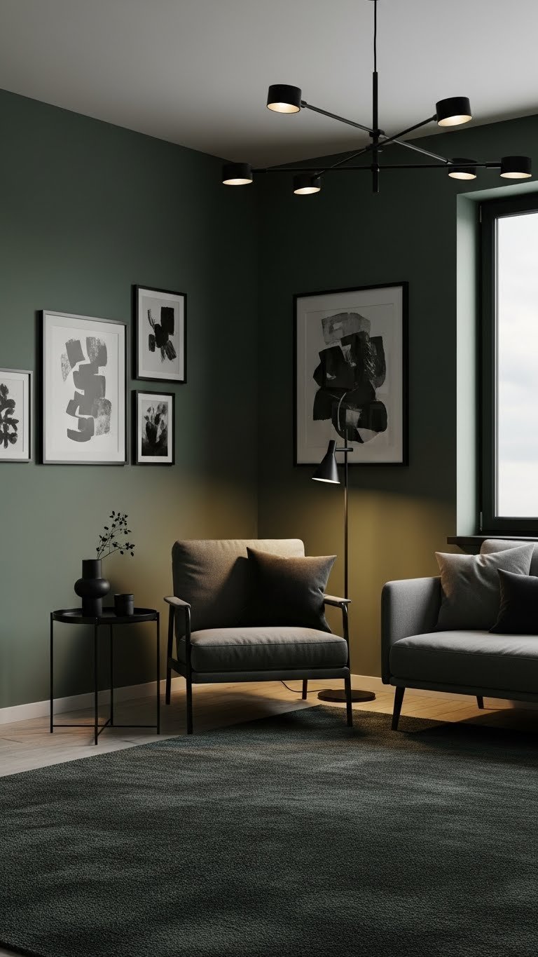 When you pair moody greens with black accents, the room takes on a dramatic, grounded calm that feels intentional rather than heavy.